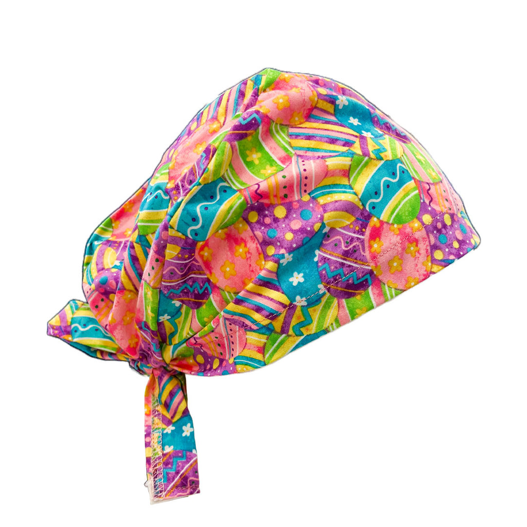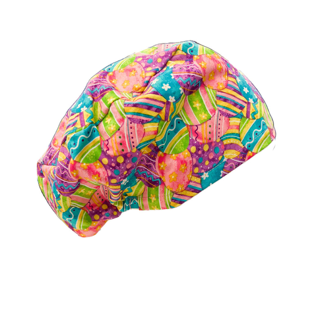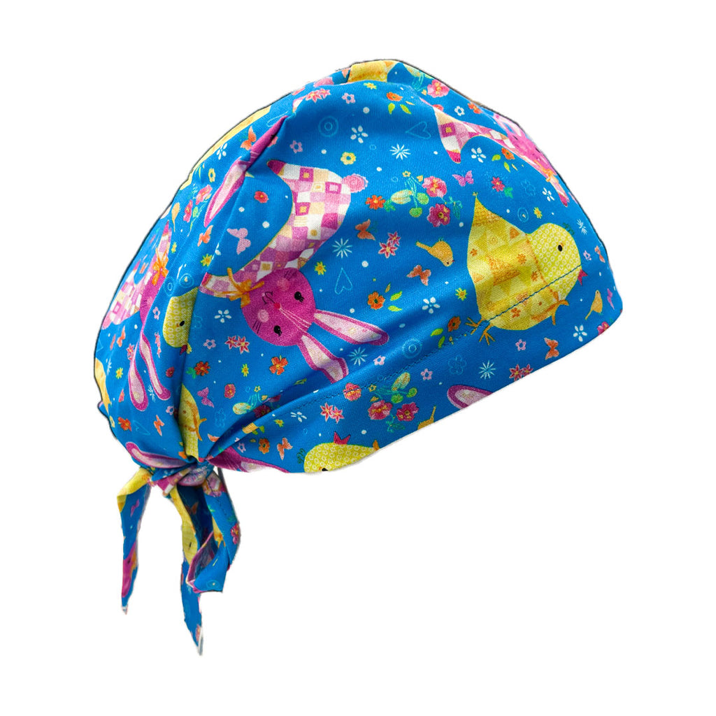 Finally, the Tie Back Bouffant Scrub Cap is an even larger version of the tie elastic back scrub hat. It secures with large ties in the back, and has a huge amount of room for longer, thicker hair.