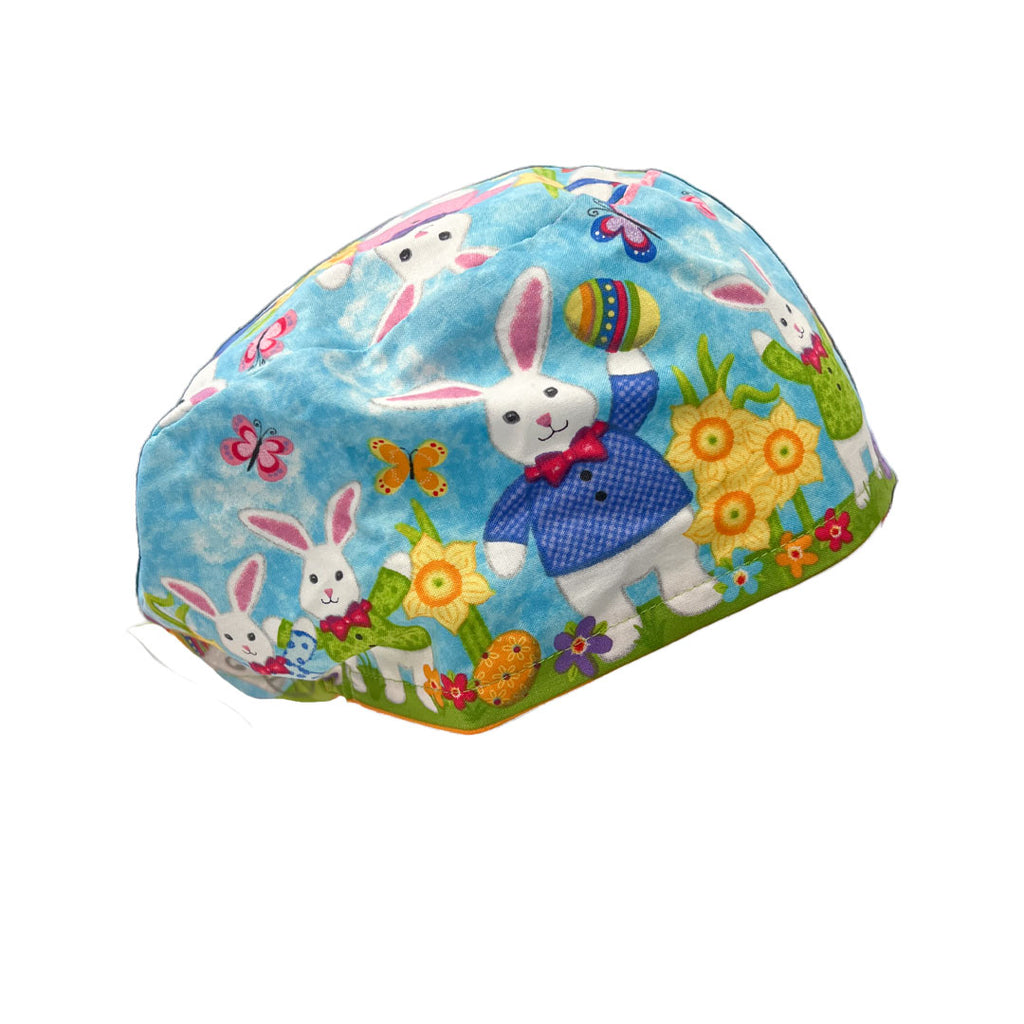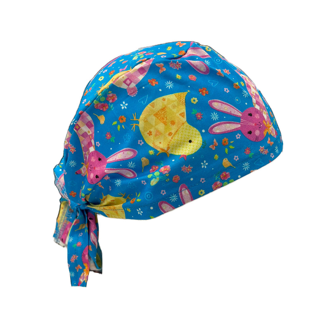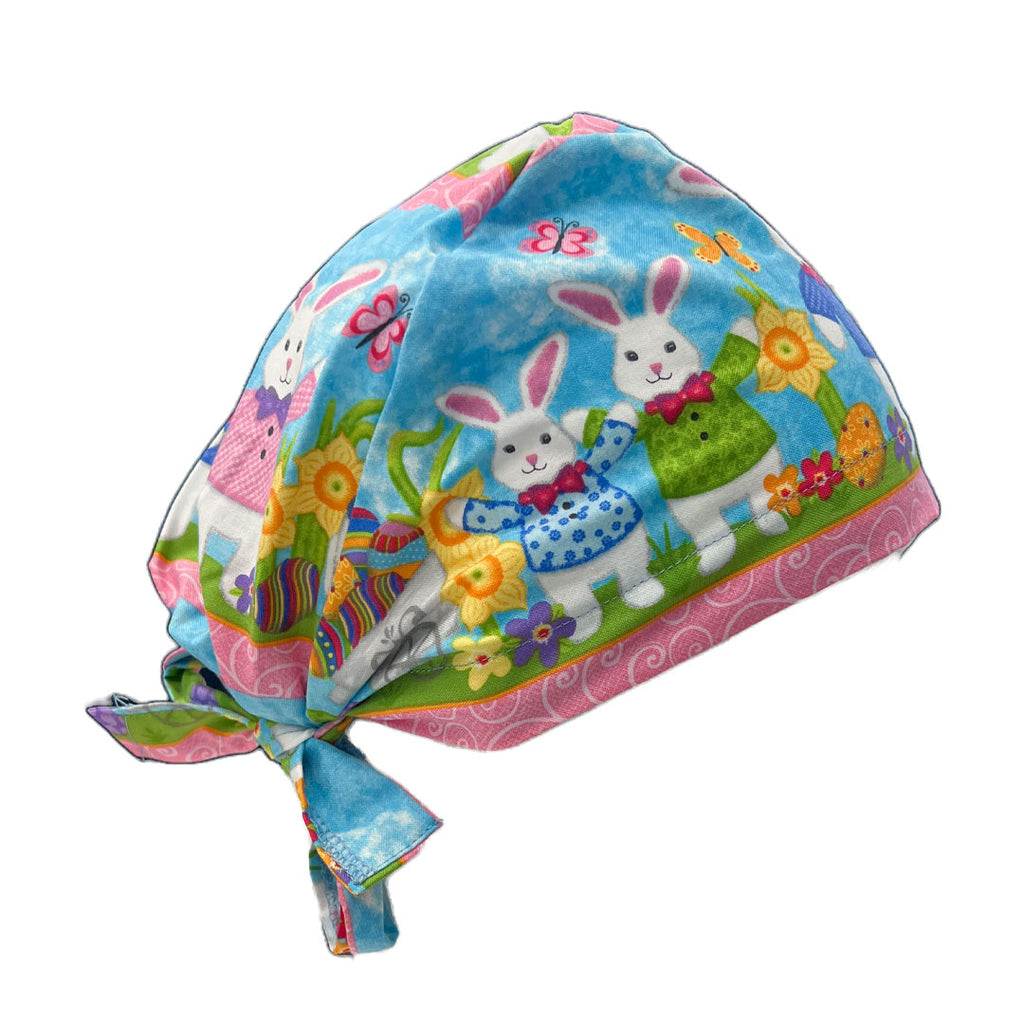Finally, the Tie Back Bouffant Scrub Cap is an even larger version of the tie elastic back scrub hat. It secures with large ties in the back, and has a huge amount of room for longer, thicker hair.