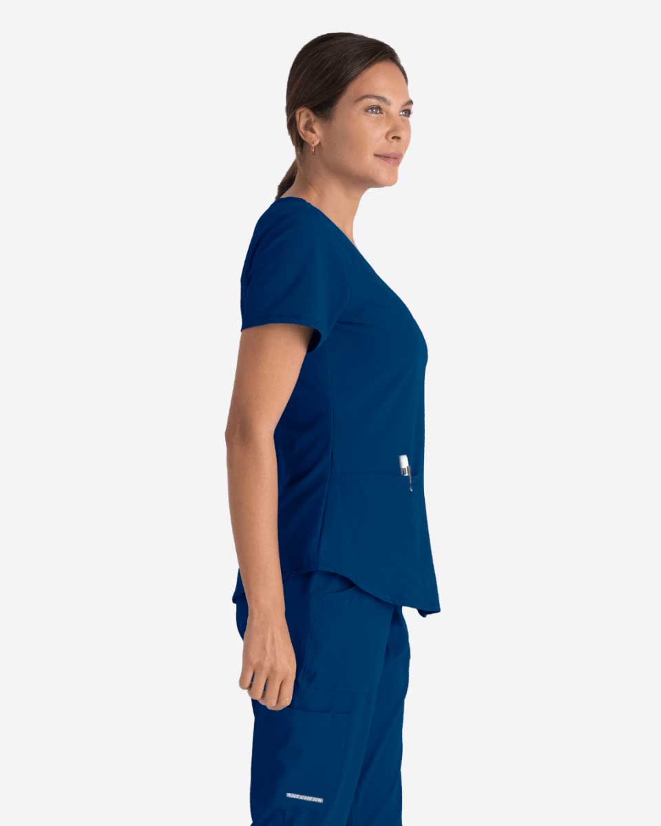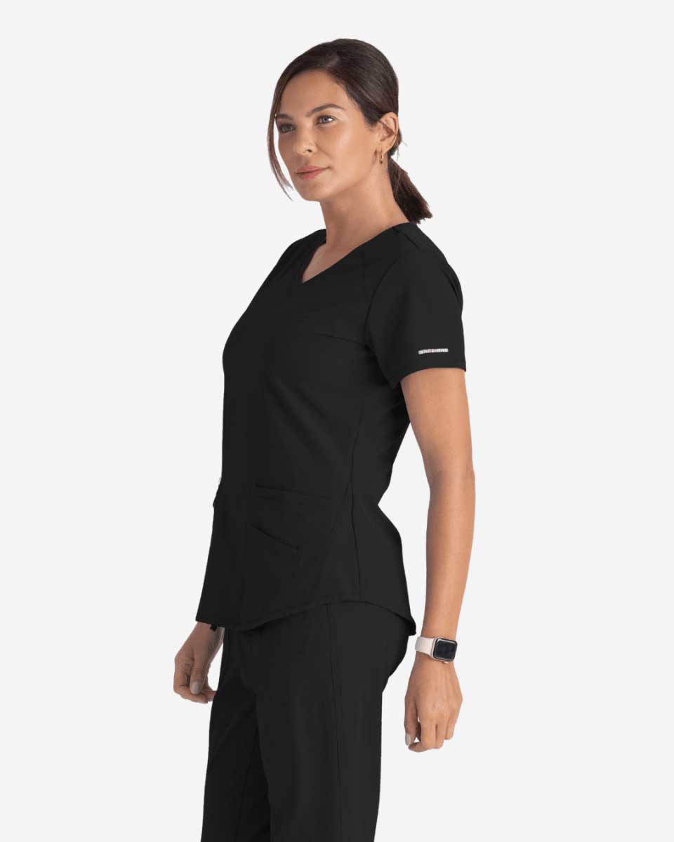 This scrub top features a stylish and flattering design with a V-neckline and a modern fit. The curved hem creates a slim look while providing extra coverage and movement at the hips.