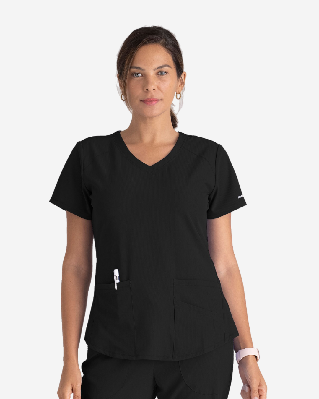 This scrub top features a stylish and flattering design with a V-neckline and a modern fit. The curved hem creates a slim look while providing extra coverage and movement at the hips.
