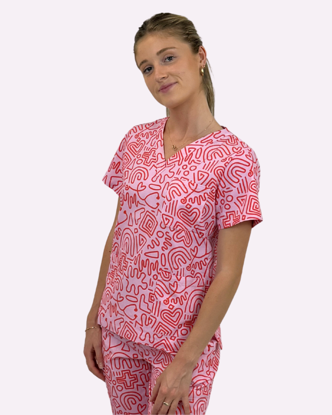 With its playful “scribbled on” print and functional design, this scrub set brings together style, comfort, and practicality—so you can feel confident and stay organised throughout your shift.